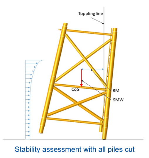For a small installation contractor, HES performed an on-bottom stability and strength assessment for the pile cutting stages of a jacket removal project. HES developed, proposed and analyzed alternative cutting strategies, that greatly increased the workability of the offshore operation, as well as reduced the amount of steel required to ensure the stability of the jacket.